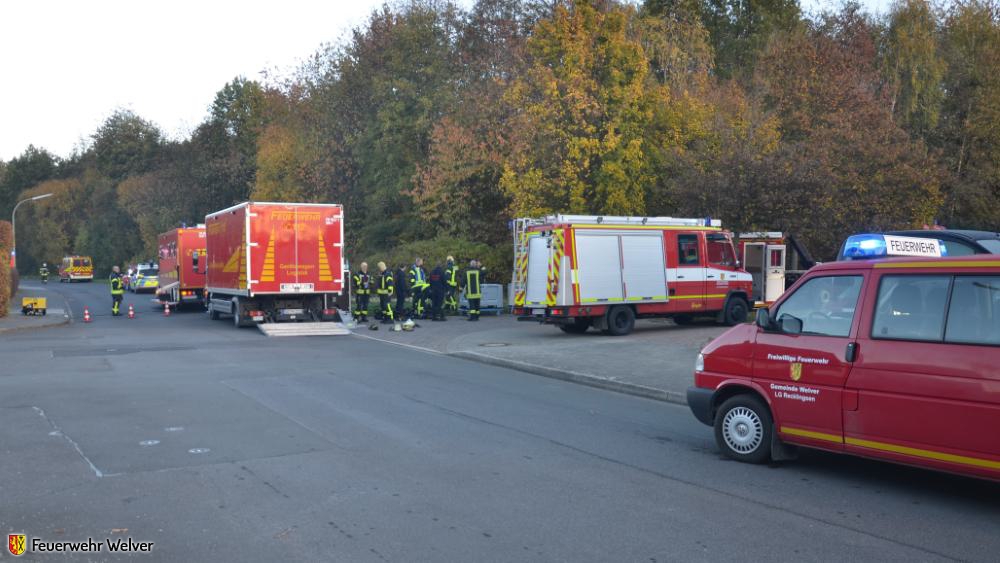 Der Leitstelle in Soest wurde am Samstagmorgen gegen kurz nach 8 Uhr ein Kellerbrand mit Menschenleben in Gefahr in Welver gemeldet. Beim Eintreffen der ersten Einsatzkräfte drang intensiver schwarzer Brandrauch aus den Kellerfenstern und Türen des Gebäudes. Vier Bewohner*innen konnten sich vor Eintreffen der ersten Einsatzkräfte selbstständig aus dem Gebäude retten und teilten den Kräften mit, dass sich noch eine Person im Gebäude befindet. Umgehend wurde ein Angriffstrupp unter Atemschutz mit einem C-Rohr zur Menschenrettung und Brandbekämpfung im Keller eingesetzt. Der Angriffstrupp konnte die vermisste Person schnell lokalisieren und aus dem Gebäude retten. Aufgrund der starken Rauchentwicklung bestand für die Person akute Lebensgefahr. Weitere Atemschutztrupps durchsuchten das Wohnhaus, wobei aber keine weiteren Personen gefunden wurden. Die Brandbekämpfung im Keller gestaltete sich aufgrund der hohen Temperaturen und einer sogenannten "Nullsicht" durch den Brandrauch für die Brandbekämpfungstrupps als sehr aufwändig und arbeitsintensiv. Nach ca. einer Stunde konnte das Feuer unter Kontrolle gebracht werden. Die Polizei hat die Ermittlungen zur Brandursache aufgenommen. ➡️ Auf dem Rückweg von der Einsatzstelle entdeckten die Einsatzkräfte auf der Bahnhofstraße in Welver einen Verkehrsunfall. Weitere Informationen im nachfolgenden Bericht |