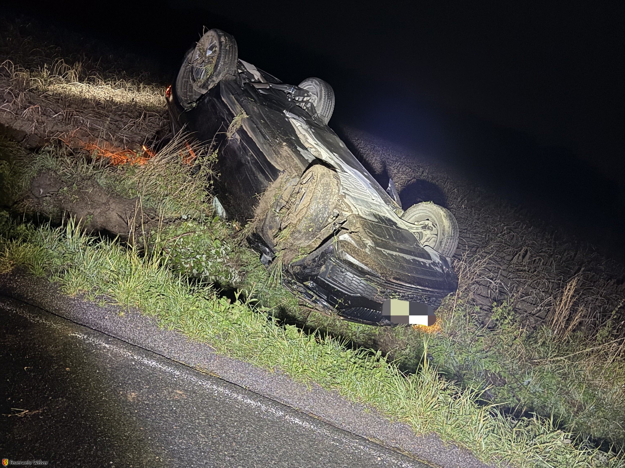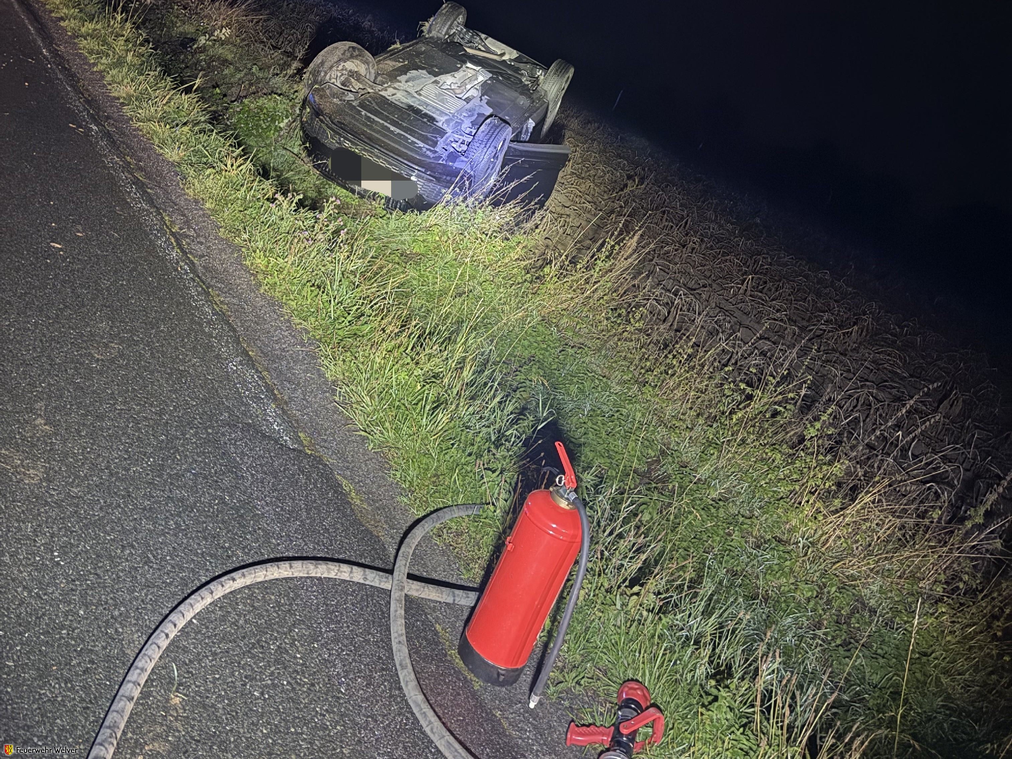 Vor Ort stellte sich heraus, dass es sich um einen Alleinunfall handelte. Ein Pkw war von der Fahrbahn abgekommen, überschlug sich und blieb auf dem Dach liegen. Beim Aufprall wurde zudem ein Telefonmast beschädigt. Der Fahrer konnte bereits vor dem Eintreffen der Feuerwehr durch eine Ersthelferin aus dem Fahrzeug befreit werden.