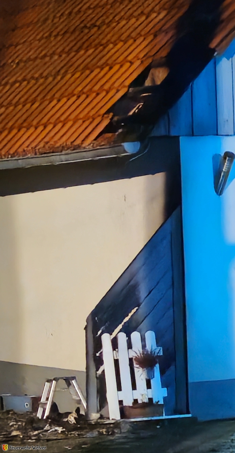 Die Einsatzkräfte der Einheit Welver hatten gerade die Einsatznachbesprechung des vorherigen Einsatzes abgeschlossen, als die Leitstelle Soest die Feuerwehr zu einem Mülltonnenbrand an einer Garage alarmierte. Durch den glücklichen Umstand, dass sich noch ausreichend Einsatzkräfte am Gerätehaus befanden, konnten die ersten Löschfahrzeuge unverzüglich ausrücken und bereits rund drei Minuten nach Eingang des Notrufs an der Einsatzstelle eintreffen. Vor Ort stellte sich die Lage deutlich dramatischer dar als zunächst gemeldet. Beim Eintreffen der ersten Einsatzkräfte standen mehrere Mülltonnen sowie Unrat unmittelbar am Gebäude in Vollbrand. Das intensive Feuer hatte bereits auf Teile des Dachstuhls übergegriffen. Ein Angriffstrupp unter Atemschutz leitete umgehend die Brandbekämpfung ein und setzte zwei C-Rohre ein, um eine Durchzündung des Dachstuhls sowie eine weitere Brandausbreitung zu verhindern. Aufgrund der Brandeinwirkung auf den Dachstuhl mussten über eine Leiter mehrere Dachpfannen aufgenommen werden, um verbliebene Glutnester gezielt abzulöschen. Im Inneren der Garage wurde mittels Wärmebildkamera eine weitere Brandausbreitung ausgeschlossen. Nach etwa einer Stunde konnte die Einsatzstelle an die Polizei zur weiteren Brandursachenermittlung übergeben werden. |