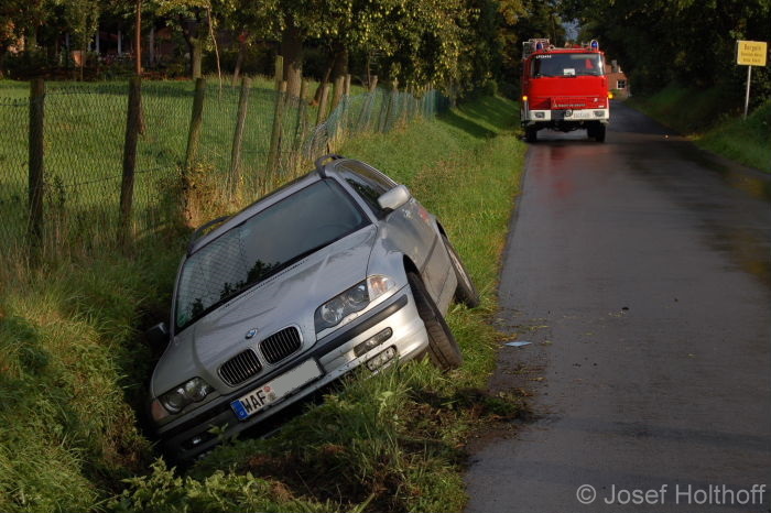 Bedingt durch die nasse Fahrbahn ist ein BMW auf dem Butterkamp in Borgeln ins Schleudern geraten und in den Strassengraben gerutscht. Das zufällig vorbeifahrende LF 8 der Löschgruppe Borgeln sicherte die Unfallstelle bis zum Eintreffen der Polizei ab. Verletzte gab es nicht. |