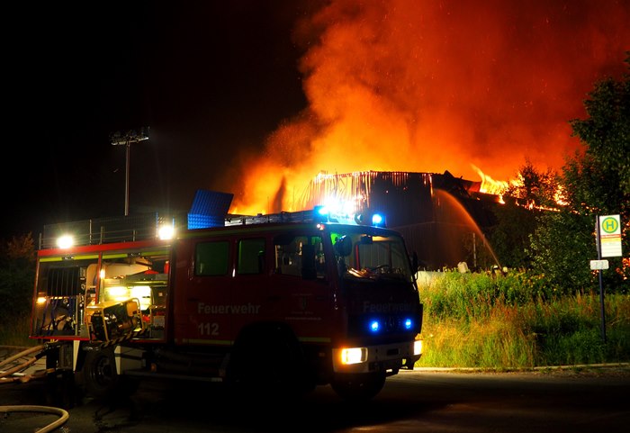 Der erste Zug der Feuerwehr Welver wurde gegen 02:30 Uhr mit dem Alarmstichwort „Brand_2 Gebäudebrand im Industriegebiet am Bierbäumchen“ nach Scheidingen alarmiert. Bei Eintreffen des ersten Löschfahrzeugs brannte die Halle im hinteren Bereich. Sofort wurde eine Alarmstufenerhöhung auf Brand_3 durchgeführt und somit der 2. Zug sowie die Drehleitern aus Werl und Soest angefordert. Beim Aufbau des ersten Löschangriffs kam es zu einer Durchzündung im Dachbereich, sodass die gesamte Lagerhalle in kürzester Zeit in Vollbrand stand. Um auf das Firmengelände zu gelangen, musste das Zufahrtstor gewaltsam geöffnet werden. Der massive Wassereinsatz überlastete schnell das zur Verfügung stehende Hydrantennetz. Um den personellen Bedarf für den weiteren Löschangriff und den Aufbau weiterer Wasserversorgungen zu decken, wurden der 3. Zug der Feuerwehr Welver, die Löschgruppe Hamm-Wambeln, und jeweils ein Löschzug aus Werl und Soest nachgefordert. Letztere Feuerwehr brachte zudem zwei Wechsellader mit Wasser-Schaum-Containern zur Einsatzstelle.